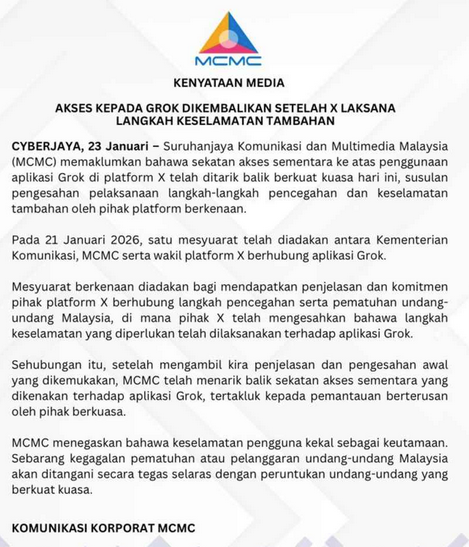 Keputusan pencabutan pemblokiran tersebut diumumkan Komisi Komunikasi dan Multimedia Malaysia (MCMC) pada Jumat (23/1/2026), seusai pertemuan antara regulator dengan perusahaan teknologi yang berada di bawah kendali Elon Musk.